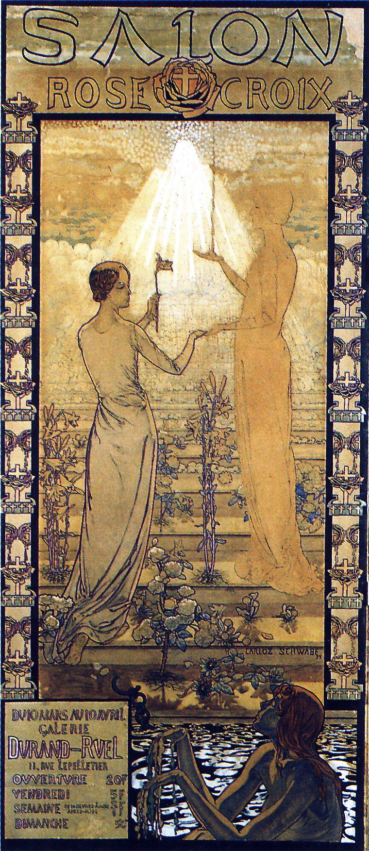 En mayo de 1888, por voluntad propia y tras completar los complejos trámites burocráticos necesarios ante las autoridades consulares, solicita y obtiene la nacionalidad suiza, una identidad legal que conservará con estricto rigor administrativo durante el resto de su vida y que le servirá de salvaguarda en futuros conflictos internacionales. Su situación económica experimenta un leve respiro hacia 1890, cuando comienza a establecer vínculos con editores menores y círculos artísticos que le permiten abandonar definitivamente el diseño industrial masivo para concentrarse en la ilustración de autor. En 1891, se produce un hito logístico y profesional determinante: el escritor y líder esotérico Joséphin Péladan le encarga la creación del cartel para el primer Salón de la Rose-Croix. Schwabe dedica meses de trabajo intensivo en su modesto taller a esta tarea, que requiere la contratación de modelos profesionales pagados por hora y la compra de pigmentos de alta calidad y papeles de gran formato que comprometen la totalidad de sus ahorros personales del momento. La entrega y posterior exhibición de esta obra en el año 1892 funciona como una plataforma de visibilidad pública sin precedentes, permitiéndole negociar sus primeros contratos de ilustración de libros con honorarios profesionales significativamente superiores y marcar el fin definitivo de su larga etapa de subsistencia básica en los suburbios parisinos, permitiéndole alquilar un estudio con mejores condiciones de luz y espacio en la Rue de l'Abbaye.